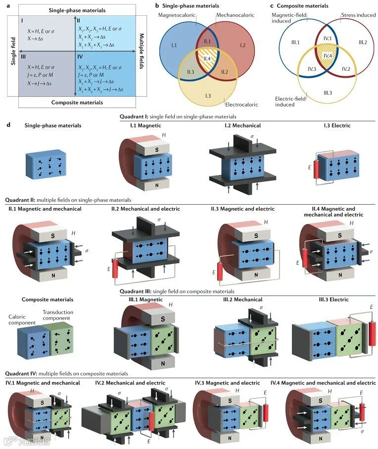图1. 固态相变制冷多场响应材料与器件设计。根据材料类型(单相材料或复合相材料)以及外场个数(单个或多个),(a)可归类固态相变制冷类型。针对(b)单相材料和(c)复合相材料的磁热、电热和力热效应,细分单场致效应和多场致效应之间的关系。(d)多场响应材料与器件的分类设计。
