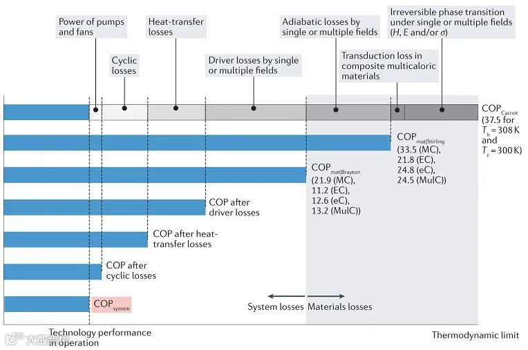 通过综合分析一级相变制冷材料中减小相变滞后的策略与机理,发现在功-能转换过程中滞后损耗所带来的损耗功,主要通过其在输入功的占比,以及改变用于逆向转变的弹性能来影响材料的功能寿命。基于实验结果,提出损耗功在输入功占比小于10%是一级相变制冷材料达到百万次循环以上功能寿命的延寿准则,建立了一级和二级相变所对应的功能寿命预测公式。更重要的是,基于能量形式建立的延寿准则和公式,可从单场效应材料体系推广至多场效应体系,具有普适性,表明了力磁电多场响应材料内禀序参量与共轭外场具有共同的驱动因素。从材料制冷性能系数出发,揭示了驱动损失、传热损失、循环损失、寄生损失四类损失对于器件制冷性能系数逐级削减的影响规律(图2),完善了在器件设计中,多场材料与器件的性能评价体系。同时,以磁性形状记忆合金为模型材料,获得的多场协同增效制冷器件,核心材料性能指数为24.5,达到同期国际最高水平。