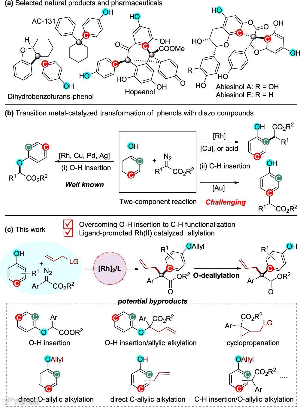 该工作采用Rh2(OPiv)4/Xantphos的组合,发展了苯酚、重氮化合物与烯丙基底物的三组分反应,实现了苯酚的对位C(sp2)-H键官能团化和烯丙基烷基化的串联过程,避免了常规的苯酚与二价铑卡宾的O-H键插入。在机理研究中,作者发现碱添加剂对于实现苯酚对位C(sp2)-H键官能团化至关重要。此外,该方法具有所采用的起始原料易得,反应条件温和,底物普适性广和产物便于衍生化等优势,并且在天然产物或者药物分子的后期修饰中也展现出潜在的应用前景。