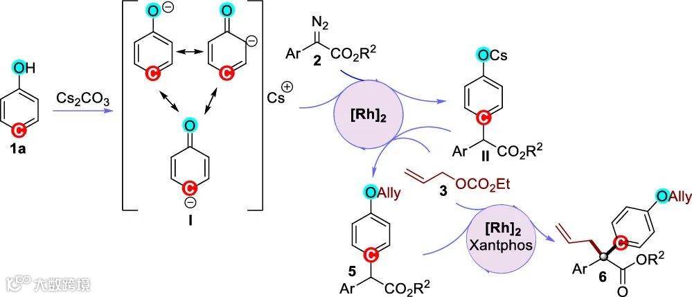 基于相关的文献报道和本文的实验结果,作者认为该反应可能经历苯酚对位C(sp2)-H键官能团化和烯丙基烷基化的串联过程(图3)。碱添加剂对于反应活性和选择性至关重要。通过控制实验,作者推测,在碱性条件下酚形成了酚盐,从而提升了芳环C4位的亲核能力,最终实现了金属铑卡宾与苯酚对位C(sp2)-H键的官能团化。双膦配体Xantphos对于烯丙基烷基化过程不可或缺,作者初步认为,强-donor双膦配体与双铑络合物的配位增强了Rh(II)的电子密度,从而赋予了双核铑在烯丙基化反应中的新颖催化活性,深入的机理研究有待于进一步开展。