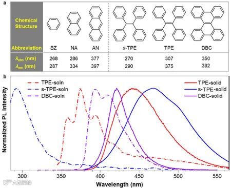 在分子光物理理论中,通过共价键产生的共轭结构被认为是有机发光分子产生电子跃迁的基础。众所周知,更大的 TBC将产生更强的电子跃迁和更优异的光物理性能,尤其是对于具有稠合芳环结构的分子。然而,基于TBC的原理往往仅适用于单分子或稀溶液状态,在聚集态下,发光体系会展现出与TBC原理相反的行为(图1)。