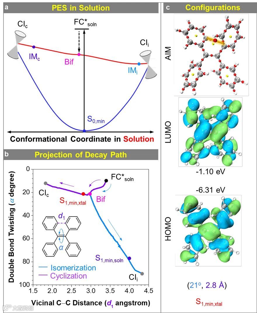 通过进一步的最小能量路径(MEP)计算,作者发现溶液状态下TPE的激发态会向顺反异构化的方向演化,最终到达最小能量交叉点而发生非辐射衰减。由于溶液状态下,分子运动剧烈,顺反异构方向势能面平坦,因此TPE不能展现TSI特征的发光。但在固态下,由于分子运动大幅受限,顺反异构路径被完全抑制,TPE转向部分受限的光诱导成环路径,并最终到达稳定的激发态能量最小点(S1,min,xtal),从而发出增强的TSI特征的蓝光。