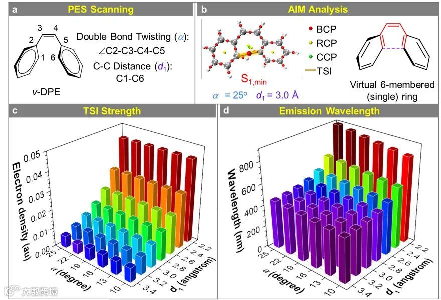 通过Atom-in-Molecules(AIM)的计算,作者实现了对TSI的定量评估,激发态势能面(PES)上对应结构的发光波长与其TSI的强度呈现准确的正相关关系。