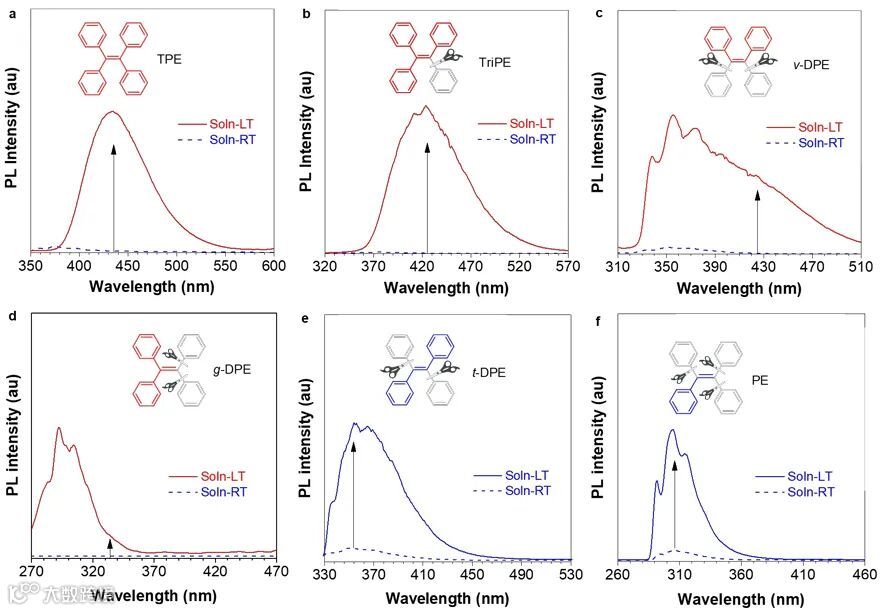 图2. 具有不同数量与位置的苯环的衍生物在常温(RT)与低温(LT)下的光致发光谱。