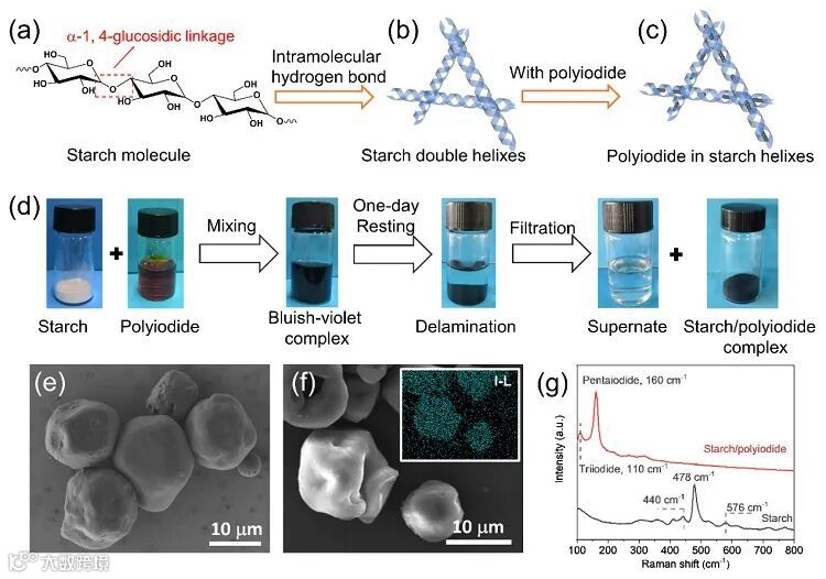 作者阐述了淀粉-碘复合物的形成过程。淀粉是由吡喃糖单元组成的聚合物链,并通过分子间氢键形成双螺旋结构。而碘能够嵌入双螺旋结构中,形成紫黑色的淀粉-碘复合物。通过SEM观测到淀粉颗粒尺寸大约在10微米左右,并且经过碘吸附后,表面没有明显的碘物种结晶,然而元素分析显示了碘信号遍布整个淀粉颗粒(图1f),表明了碘吸附在淀粉内部,而不是仅仅是表面吸附。通过一系列的结果表明了淀粉与碘的相互作用,并探测了淀粉中的优势碘物种为碘五离子。