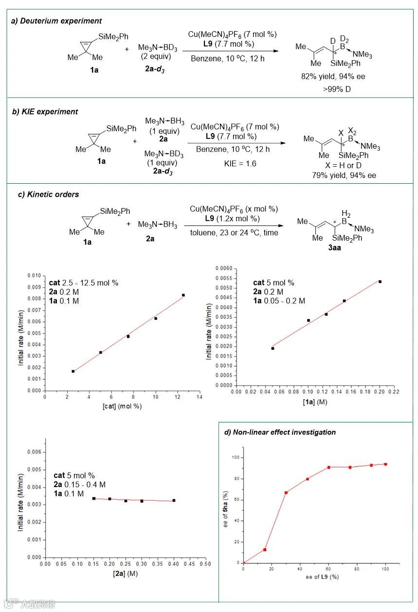 研究者对反应机理进行了初步探究(图4)。动力学级数表明反应对催化剂、环丙烯为一级、硼烷为零级,环丙烯开环为决速步。反应展现出明显的正非线性效应,说明反应的活性铜催化剂可能具有双核乃至多核结构。