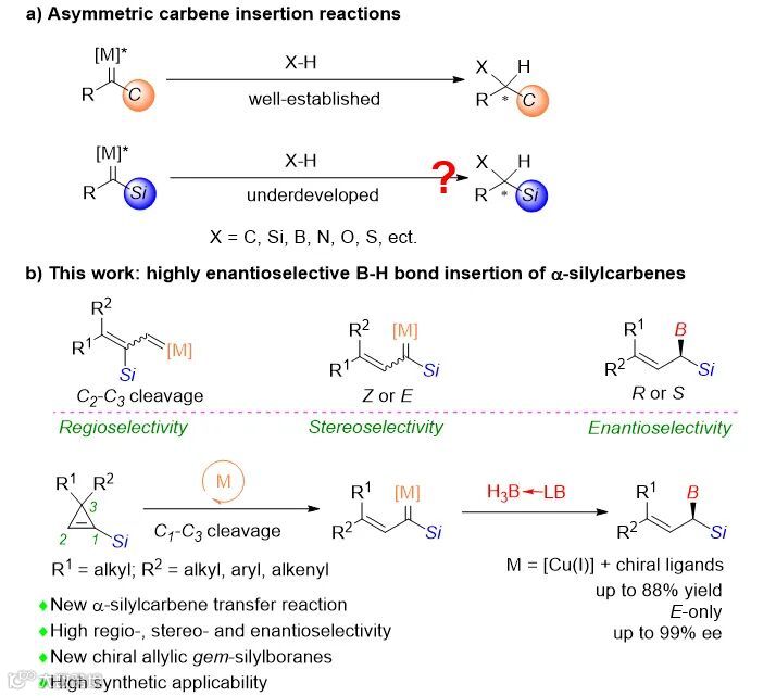 图1. (a)不对称卡宾插入反应;(b)α-硅基卡宾的高对映选择性B-H插入反应。图片来源:Angew. Chem. Int. Ed.
