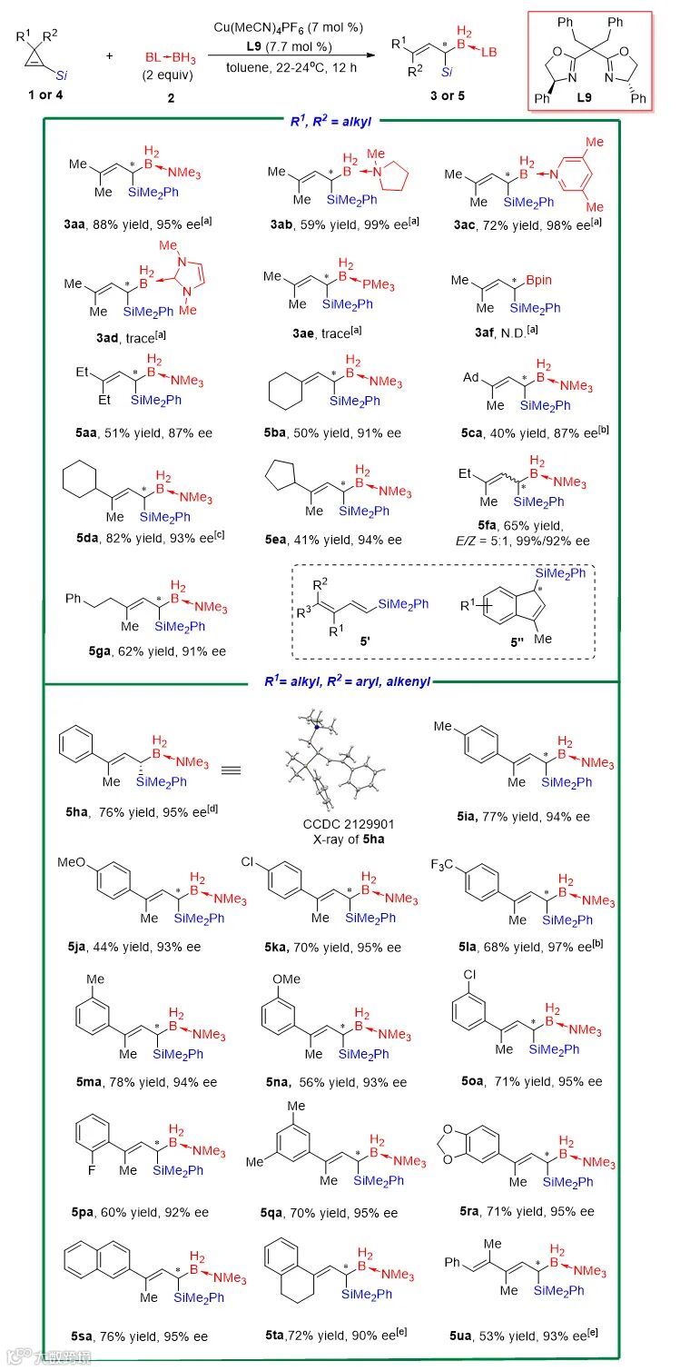 以铜/手性双噁唑啉络合物为催化剂,在温和条件下,多种3,3-双取代的环丙烯底物均能够以中等或以上的收率(40-88%)以及优异的对映选择性(87-99%)得到E式构型的手性偕硅硼产物(图2)。其中,3,3-双烷基取代底物的副产物主要是共轭二烯基硅5’,而3-芳基-3-烷基取代底物的副产物则为1-硅基茚5’’。