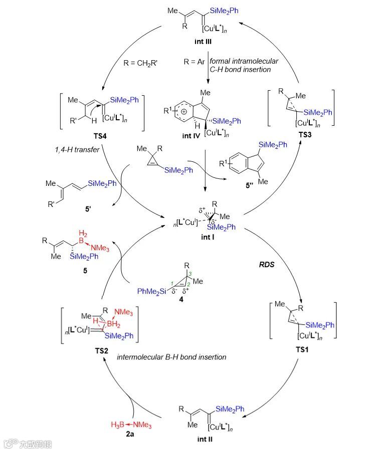 基于这些机理实验以及观察到的副产物,研究者认为硅基空3d轨道和环丙烯的d-π共轭极化了环丙烯的烯键,与硅基相连的C1具有更多的负电荷,更容易被铜催化剂进攻进而发生C1–C3键断裂生成E式或Z式的金属卡宾(图5)。E式卡宾与硼烷发生不对称B–H键插入生成偕硅硼产物。而Z式卡宾由于位阻较大,难以发生分子间的B–H键插入而只能发生分子内的副反应:当R为烷基时,发生分子内的1,4-氢迁移反应得到共轭二烯基硅副产物5’;当R为芳基时,发生分子内的亲电环化反应得到形式上C–H插入的1-硅基茚副产物5’’。这样,Z式卡宾通过分子内副反应被完全消耗,最终的插入产物只有E式一种构型。