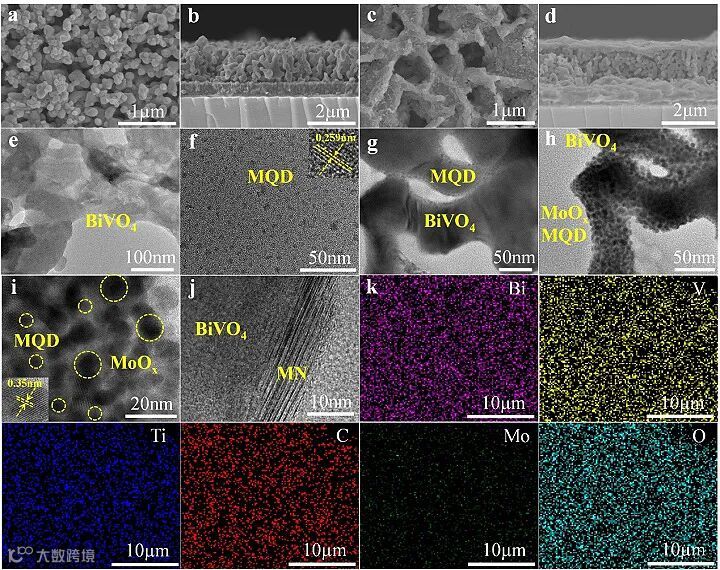 图2. (a,b) MoOx / MQD / BiVO4和 (c,d) MoOx / MN /BiVO4的平面 (a,c) 和截面 (b,d) SEM图。(e) BiVO4, (f) MQD, (g) MQD / BiVO4, (h) MoOx / MQD / BiVO4的TEM图。(i) MoOx / MQD / BiVO4和 (j) MN / BiVO4的HR-TEM图。(k) MoOx / MQD / BiVO4的元素分布图