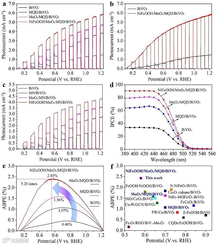 图3. (a,b,c) BiVO4、MQD / BiVO4、MoOx / MQD / BiVO4、NiFeOOH / MoOx / MQD / BiVO4光阳极与MN / BiVO4、MoOx / MN / BiVO4和NiFeOOH / MoOx / MN / BiVO4光阳极在AM 1.5 G模拟太阳光 (100 mW cm-2) 和0.5 M KBi电解质 (pH = 9.3) 下的J-V曲线比较。(d) BiVO4、MQD / BiVO4、MoOx / MQD / BiVO4、NiFeOOH / MoOx / MQD / BiVO4光阳极的IPCE和 (e) ABPE值。(f) 比较NiFeOOH / MoOx / MQD / BiVO4光阳极与之前报道的BiVO4基光阳极的ABPE值