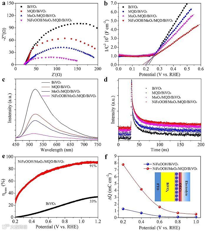 图4. (a) 电化学阻抗谱曲线。(b) Mott-Schottky曲线。(c) 稳态光致发光光谱。(d) 时间分辨光致发光衰减曲线。(e) BiVO4和NiFeOOH / MoOx / MQD / BiVO4光阳极的电荷分离效率。(f) BiVO4基光阳极在施加偏压下的电荷储存能力