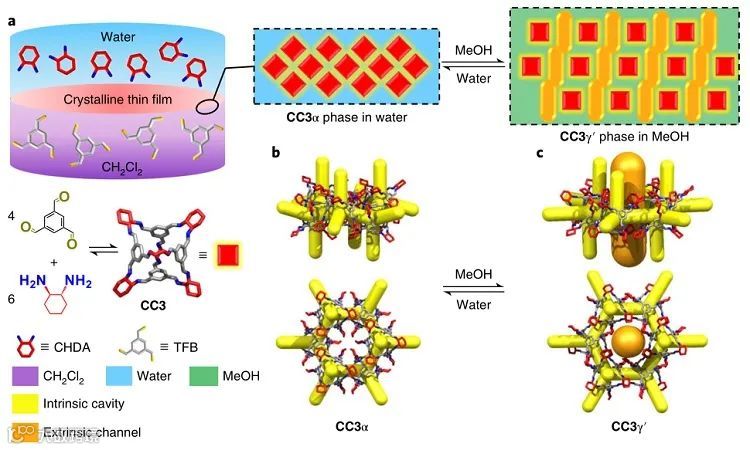 实验表明,这些分子笼膜可以通过溶剂的刺激来改变自身的膜孔结构和孔径大小。笼分子CC3在大部分溶剂中(如水、丙酮)都表现为热力学最稳定的CC3α结晶态,这是一种钻石状的三维结晶结构,分子与分子之间通过窗口对窗口(window-to-window)的方式互相堆叠起来,因而在这些分子笼内部和外部形成了互相穿插的分子通道(图1),从而对600 g•mol-1以上的分子有效截留。而由于这些晶体结构是由笼分子的非共价结晶堆叠而成,当接触到甲醇时,原本紧密堆积的分子笼晶体结构就迅速地转变成了另一种CC3γ′的结晶态(图3),从而使笼分子的堆积比CC3α态更为松散,“开启”了额外的更大的膜孔通道,允许尺寸更大的分子(600-1400 g•mol-1)通过,而这些分子会被孔道“关闭”状态下的CC3α分子笼膜截留住(图3)。
