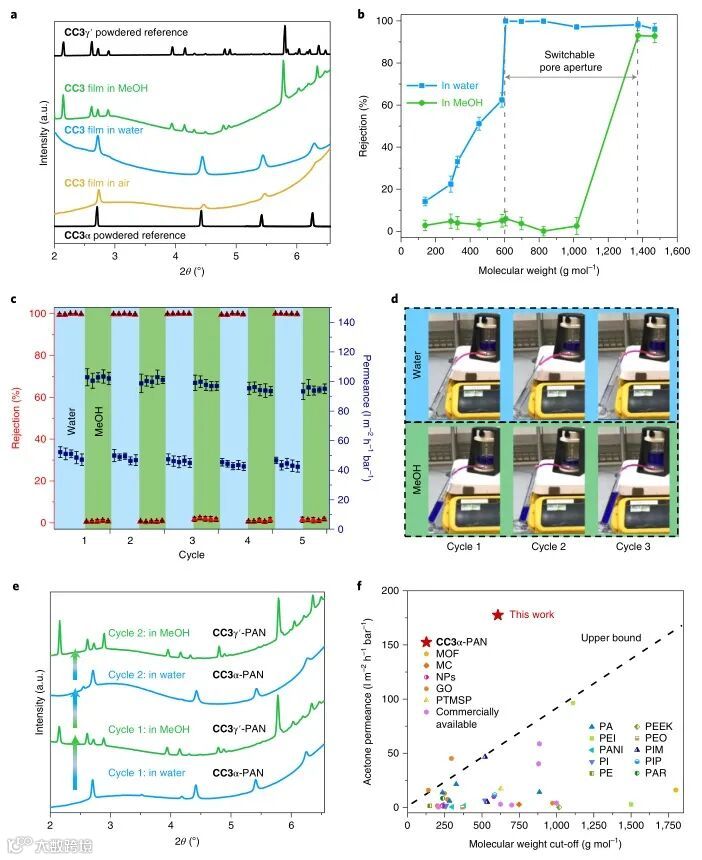 难得的是,这种“开”和“关”的状态是一种动态的、可逆的过程,并且不会破坏分子笼膜的连续性。作者使用了一张分子笼膜来演示膜孔“开关调节”的五个循环过程(图3)。可以看到,分子笼膜对于水中的蓝色染料(Brilliant Blue)有着近100%的截留率,而将溶剂置换成甲醇后,分子笼膜孔道立即“开启”,从而无法截留蓝色染料,溶剂通量也显著增大(图3)。原位X射线衍射也证明了分子笼膜在水和甲醇溶液中可以自由地在两种晶型CC3α和CC3γ′之间可逆转化。