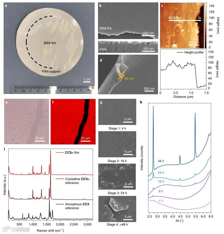 传统制备分子笼膜使用的是旋涂法,致使膜太厚,且无法控制分子笼的结晶过程。本文中,界面合成的方法被第一次应用在分子笼膜的制备上(图1)。首先,在不相溶的溶剂(水和二氯甲烷)中分别加入合成有机笼CC3的单体原料,让它们在两相溶液的界面上反应、结晶、成膜。这种生长于界面上的自支撑膜不受基底的限制,可以轻易地转移到不同材质的基底材料上。作者通过抽滤将此自支撑膜粘合到聚丙烯腈基底膜上形成复合分子笼膜。此方法可以控制分子笼膜的整个结晶过程,包括聚合成膜、自规整、可逆结晶和高度结晶(出现裂痕)四个阶段(图2)。通过对结晶过程的控制,作者优化出连续、均匀、平整的晶体薄膜,将其厚度降至80纳米,仅为旋涂法制备分子笼膜的1/4。