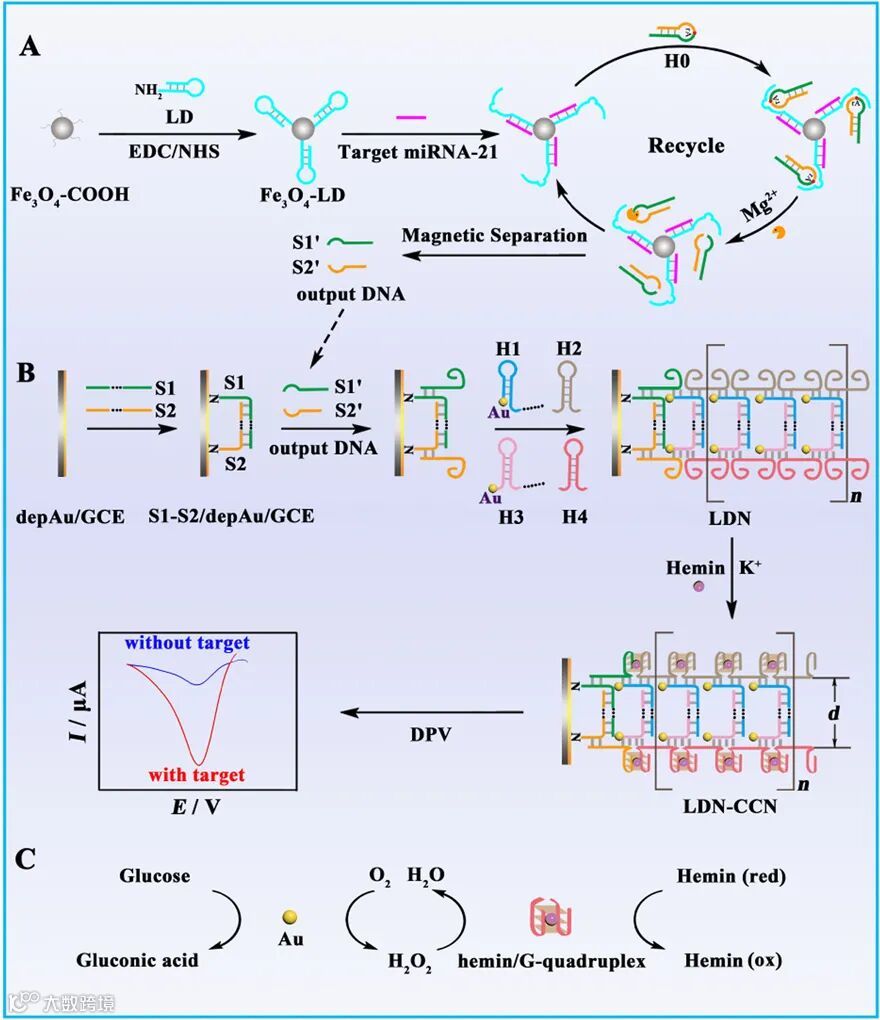 图1. (A) 目标物诱导的DNAzyme循环放大过程示意图; (B) 电化学生物传感器的构建; (C) 电化学信号响应的机理。