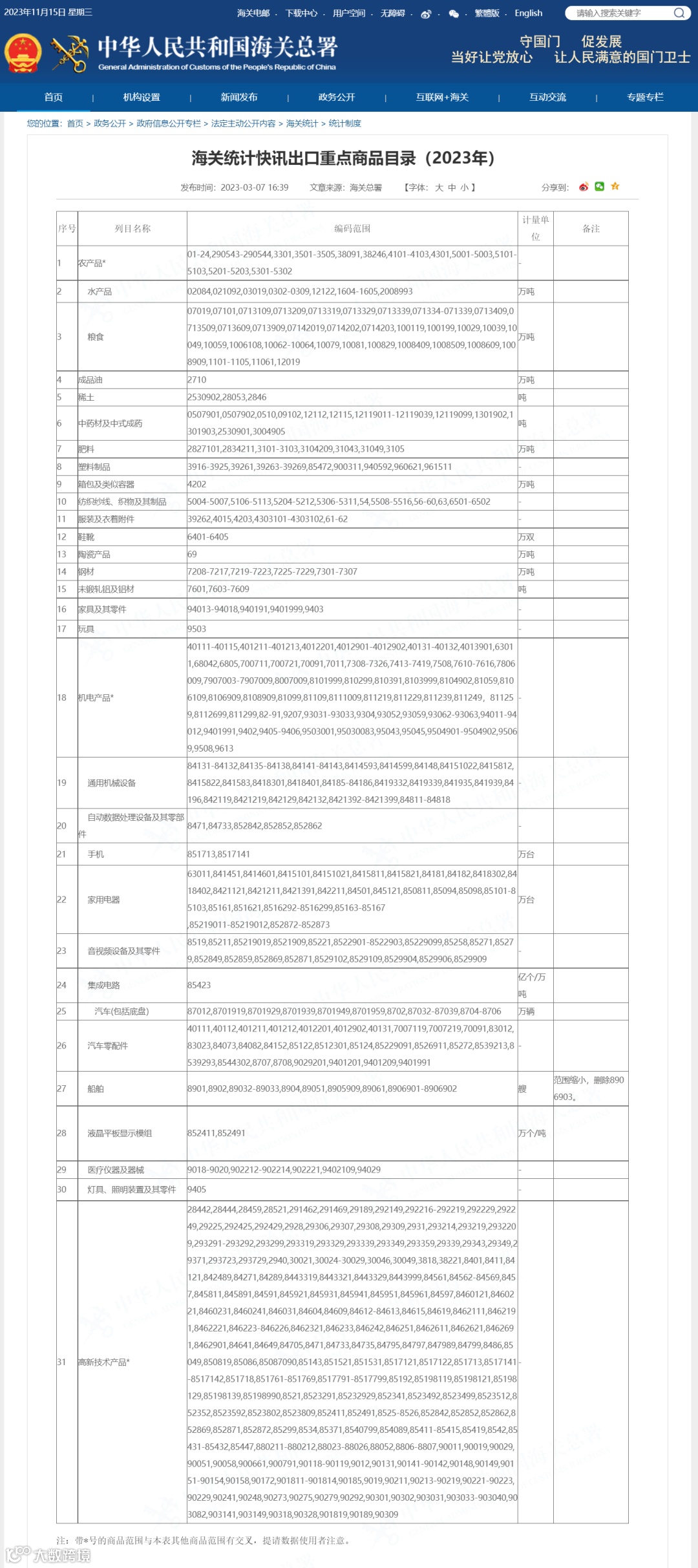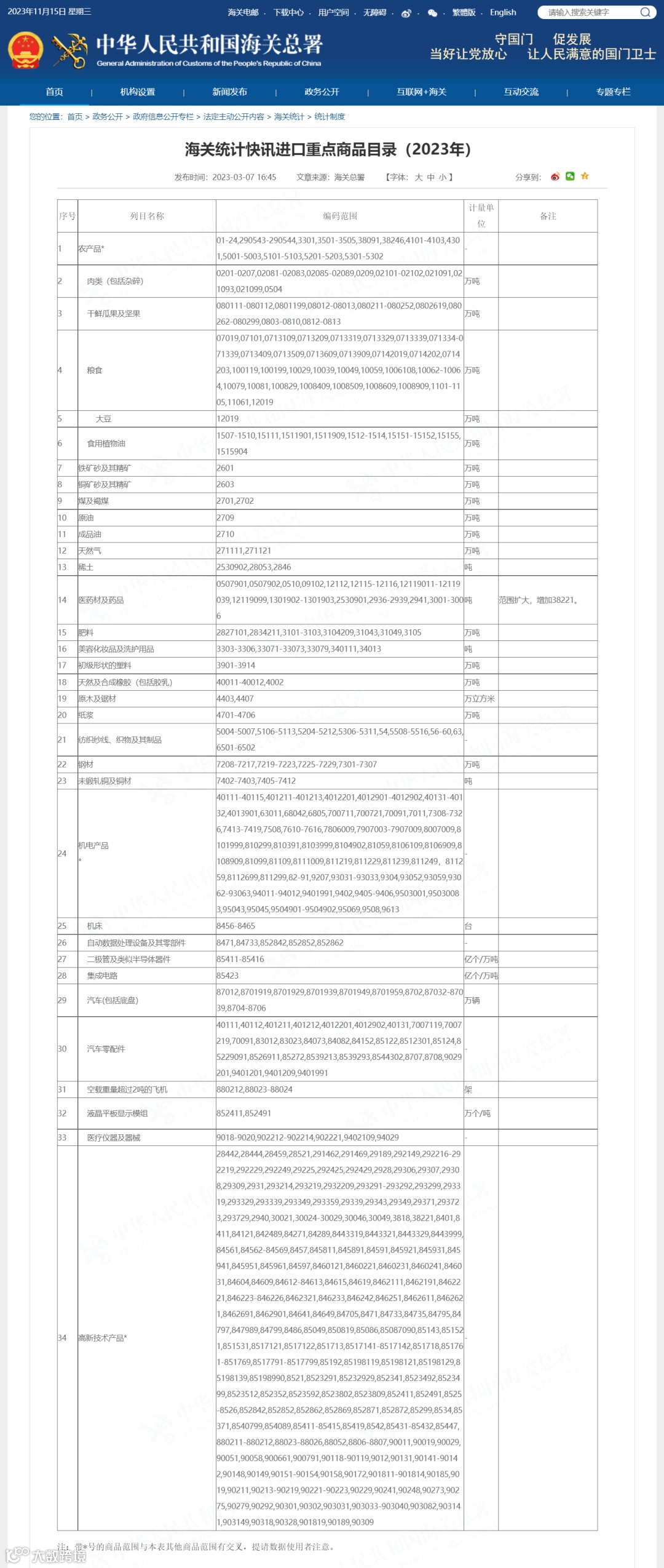 【进口清关】海关统计进出口重点商品目录(2023年)