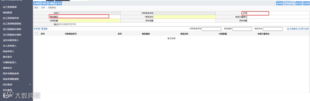 核放单类型为“5-卡口登记货物”时,表体“商品料号”、“商品编码”字段由必填改为非必填。