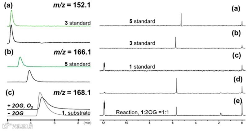 图1.(左)DfmD催化反应的LC-MS 分析;(右)使用31P NMR跟踪DfmD催化反应