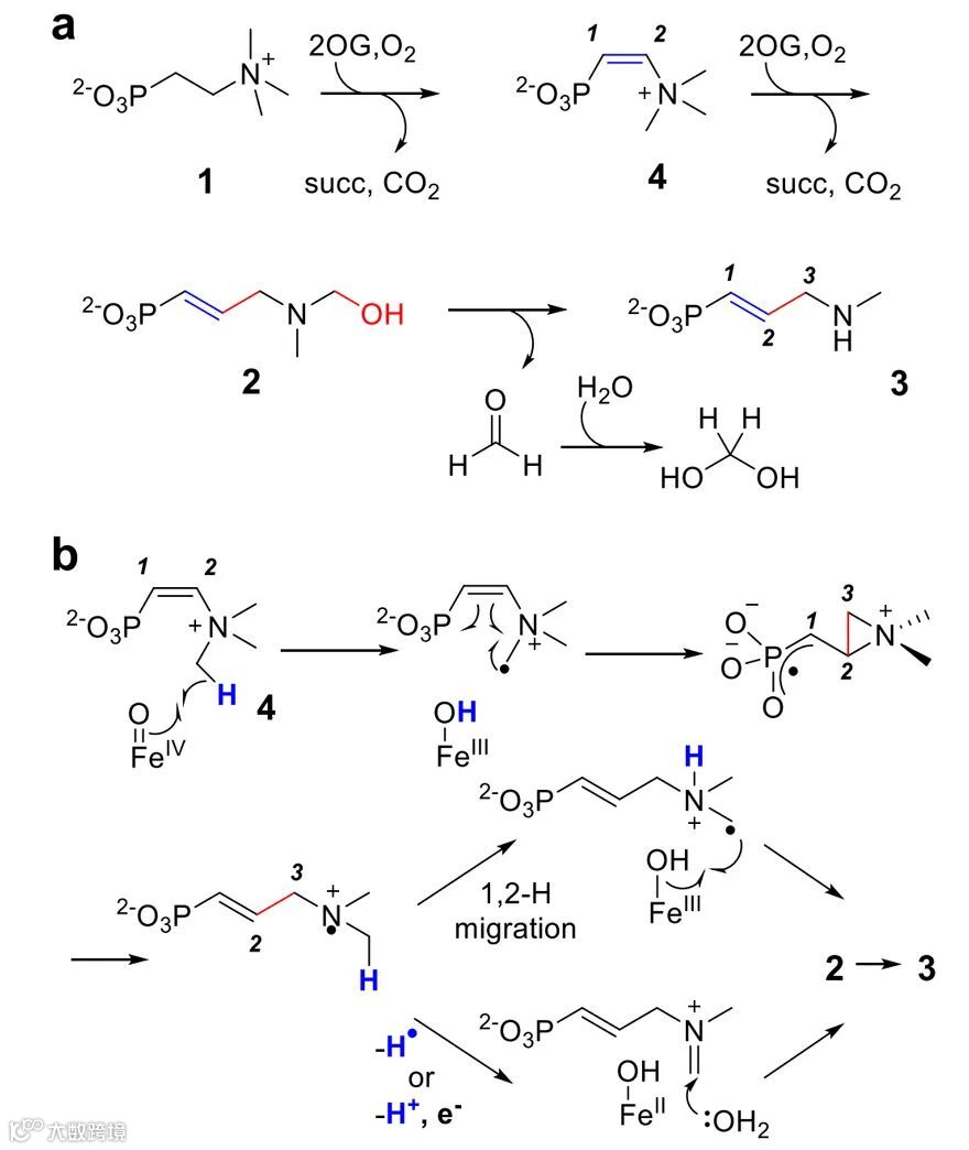 图5. (a) DfmD催化的反应涉及两步过程;(b) 可能的反应机制