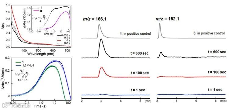 图3. DfmD 催化反应的stopped-flow吸收光谱(左),不同时间点淬灭样品的LC-MS(右)