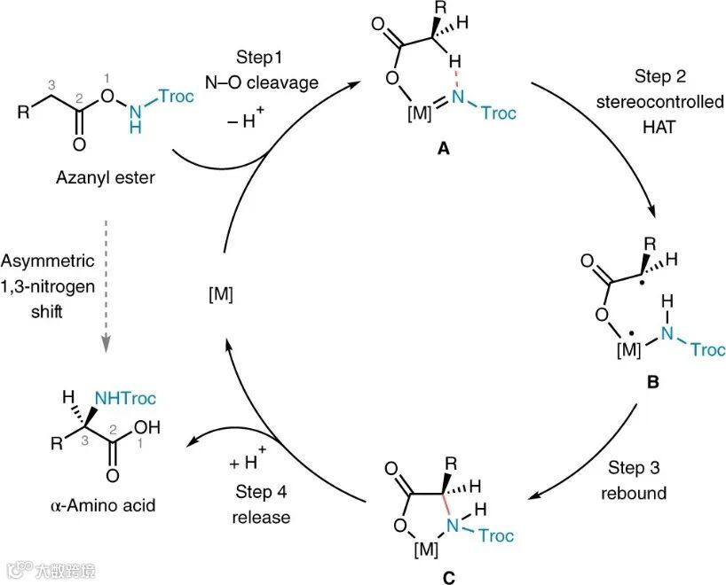 ),最后羧酸盐的质子化诱导产物解离并结束催化循环。从整体来看,N-O 键断裂和随后的逐步 C-H 键插入实现了不对称的 1,3-氮迁移,从而合成手性 α-氨基酸。