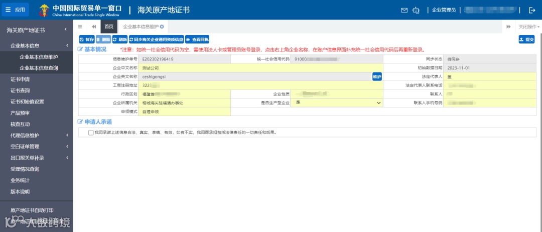申请人可以在“企业基本信息查询”模块查看企业当前在海关已经入库成功的原产地企业基本信息。