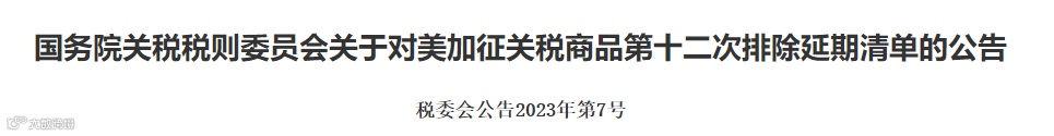 根据《国务院关税税则委员会关于对美加征关税商品第十次排除延期清单的公告》(税委会公告2023年第1号),对美加征关税商品第十次排除延期清单将于2023年9月15日到期。国务院关税税则委员会按程序决定,对相关商品延长排除期限。现将有关事项公告如下: