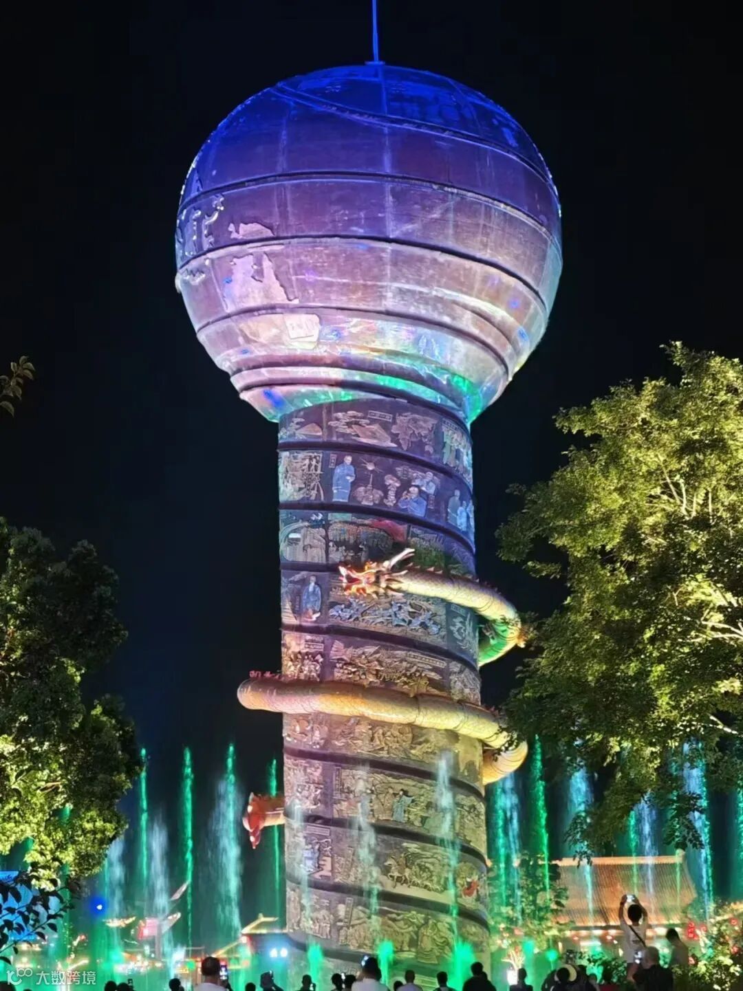 在象征华夏财神文化上金谷,谷深径幽,湖光山色,紫气升腾。夜间大型幻梦灯光秀、无人机表演、巨龙随着音乐和喷泉沿着龙柱而上,在西施花街大舞台前观看真人演绎的范蠡大剧,大家流连忘返。