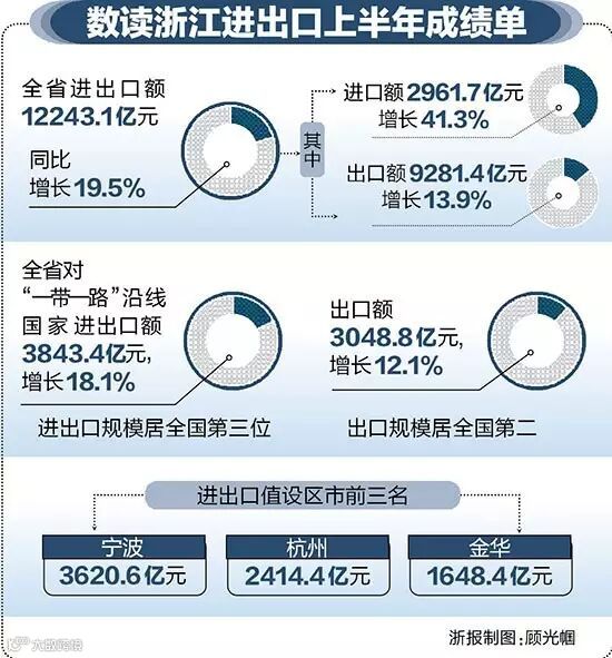 而从各市外贸成绩看,上半年,宁波、杭州、金华分别以3620.6亿元、2414.4亿元和1648.4亿元的进出口值位列全省前三名,分别增长26.2%、15.2%和14.8%,对全省外贸增长贡献度分别达到37.6%、15.9%和10.6%;其中,宁波、金华、嘉兴为出口贡献度前三名,宁波、杭州、嘉兴为进口贡献度前三名。