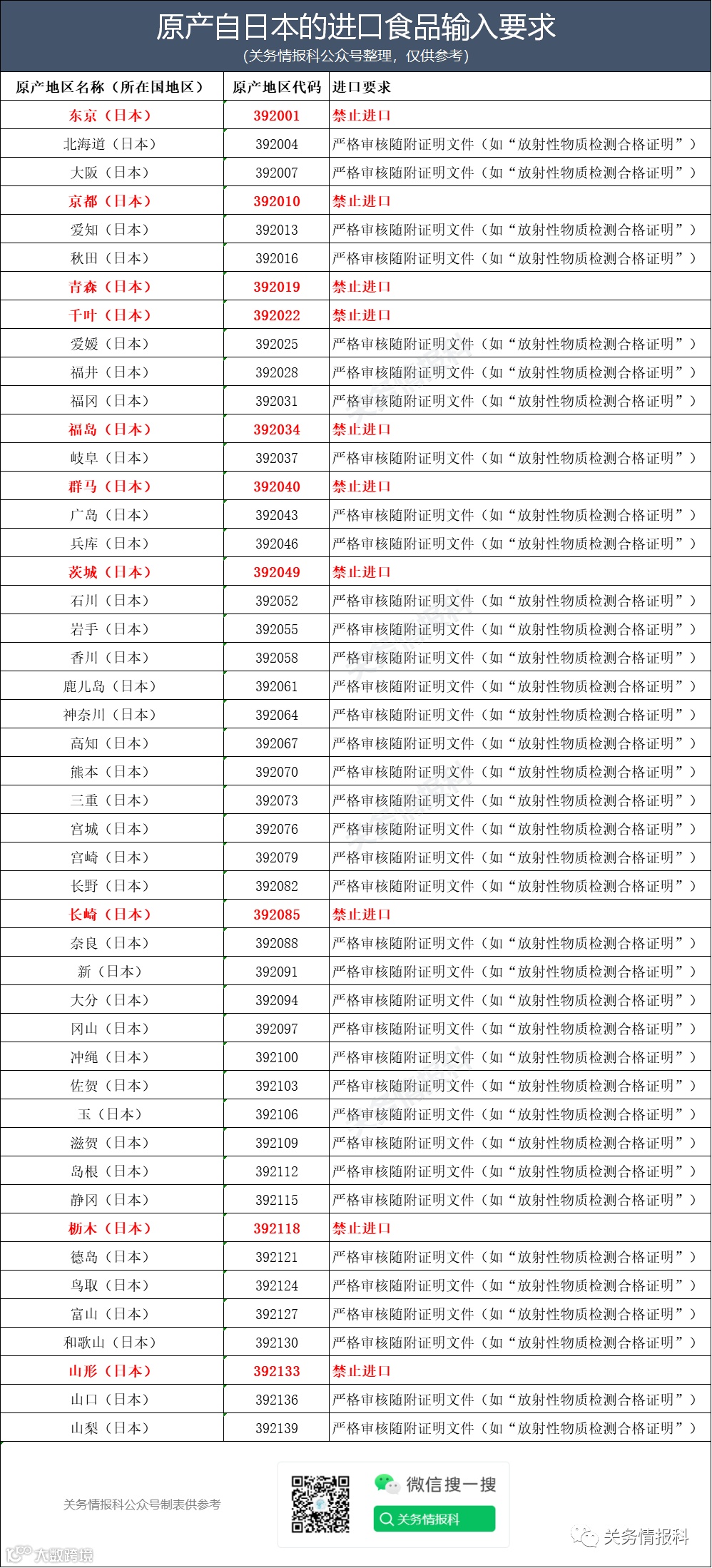 关务情报科公众号备注:日本福岛核事故发生后,日本政府根据辐射水平对各县进行了分类,将其分为不同的等级。其中,辐射水平最高的10个县被称为“核辐射十县”。下列日本核辐射十县名单供参考,实际请以现场为准。