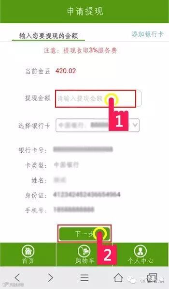 页面自动跳转,您根据提示信息,输入提现的银行卡信息,【姓名】一定要与银行卡开户人姓名一致,确认无误后点击【下一步】如图;如图所示;