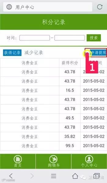 页面自动跳转至佣金积分记录,点击右上的【申请提现】按钮,如图所示;