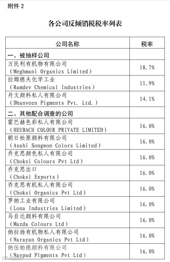 根据《反倾销条例》第三十八条规定,商务部向国务院关税税则委员会提出征收反倾销税的建议,国务院关税税则委员会根据商务部的建议作出决定,自2023年2月27日起,对原产于印度的进口酞菁类颜料征收反倾销税。