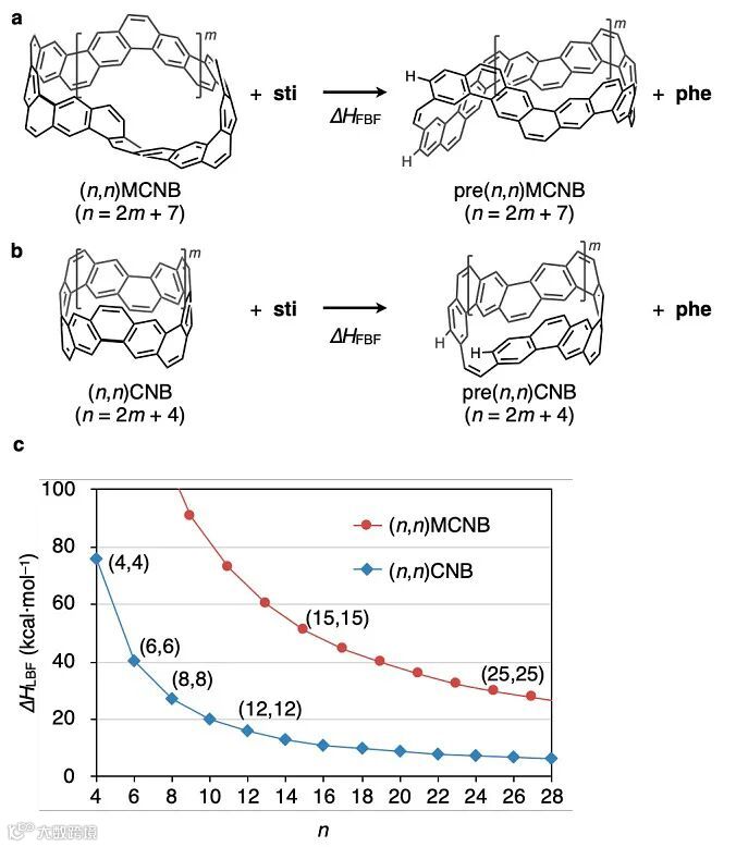 由理论计算结果可知,与同尺寸的CNBs相比,MCNBs具有更高的环张力,并且这种张力作用主要体现在最后一步成键的过程中。如下图a-b所示,最后成键步骤的张力能(ΔHFBF/kcal•mol–1)可由假设的(n,n)MCNBs、(n,n)CNBs以及对应的前驱体分子之间的同化学键反应(homodesmotic reaction)来评估,其中顺式的二苯乙烯(sti)和菲(phe)用作参考分子。结果显示MCNB的ΔHFBF远远高于CNB,如(7,7)MCNB为121.1 kcal•mol–1,而(6,6)CNB为40.2 kcal•mol–1。(6,6)CNB已经通过Ni催化的偶联反应成功被合成并分离,这表明该方法能够克服此种程度的环张力。基于此,该团队通过理论计算,选定了两种MCNBs作为目标分子来进行合成:(15,15)MCNB (ΔHFBF = 51.1 kcal•mol–1) 和 (25,25)MCNB (ΔHFBF = 29.6 kcal•mol–1)。