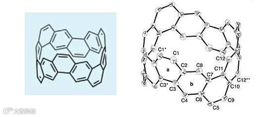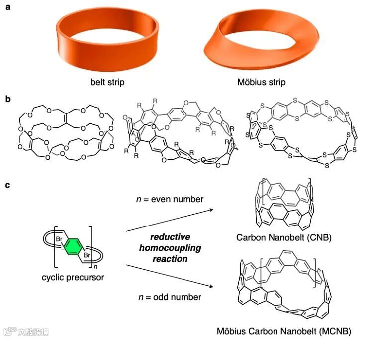 莫比乌斯带,作为不可定向曲面中最简单的一个例子,只有一个面(即单侧曲面)。具有莫比乌斯结构的芳香分子也吸引了合成化学家们的兴趣。1982年,第一例具有莫比乌斯结构的双链非共轭分子被Walba等人报道出来(下图b左)。随后Harges等人在2003年实现了单链莫比乌斯芳香分子的合成,Grażyński和Osuka对莫比乌斯芳香性做出了进一步的研究探索。尽管有多种类型的单股莫比乌斯分子被合成出来,但双股且具有芳香性的莫比乌斯分子由于存在较大的合成难度,对其的研究仍然受到较大的限制。如下图b(中、右)所示,饱和的连接单元(-CH2O-)或者硫族元素(-S-)对减少结构张力起了较大的作用。即使具有莫比乌斯结构的碳纳米带分子在上个世纪90年代就被理论预测出来,然而想要合成这种全共轭结构的纳米碳分子,仍需要合成技术的进一步发展。