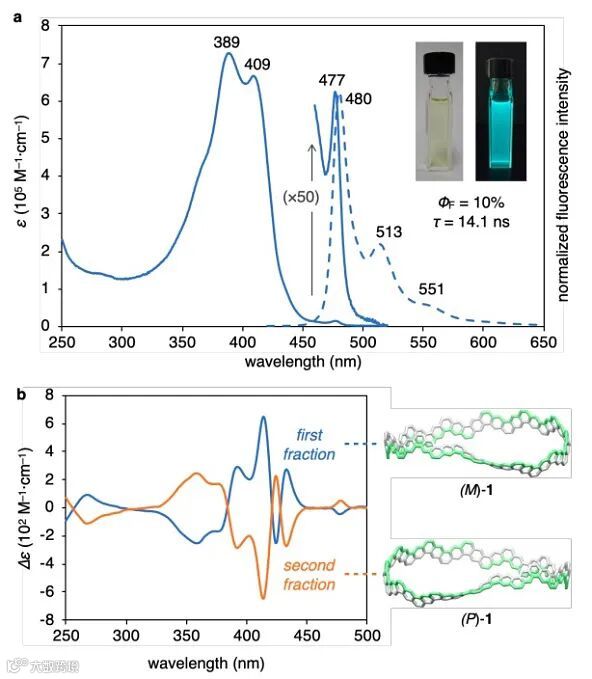 该团队继续对莫比乌斯带分子1进行了光物理性质方面的表征。如下图a所示,吸收谱中的最高峰在389和409 nm附近,同时在477 nm处有一个小的吸收峰。此外其发射光谱在380 nm光的激发下,主要峰值在480、513和551 nm处,显示出蓝绿色的荧光。分子1的荧光量子产率为10%,半衰期时间为14.1 ns,因此可以算得辐射和非辐射衰减的速率常数分别为7.1×106 S-1和6.4×107 S-1。TD-DFT(time-dependent density functional theory)计算表明分子1的S0-S1(477 nm处的小峰)的跃迁为对称允许(f= 0.6239)的过程,与具有D3h对称性的(6,6)CNB不同,这也反映了莫比乌斯结构的低对称性。随后,作者对分子1的拓扑手性也进行了实验表征。首先使用手性HPLC对分子1成功地进行了手性分离,随后采集了每个组分的圆二色谱信号图,再根据理论计算可知第一组分和第二组分分别为M-和P-型手性异构体。