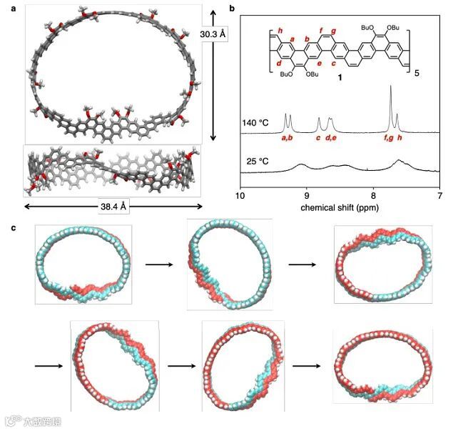 MCNB分子1的结构通过高分辨质谱以及核磁共振谱图进行了表征。其中最高峰3944.9449十分接近理论值(C280H260O20:3944.9423)并且具有相同的同位素分布峰。分子1经DFT理论计算模拟优化的结构如下图a所示,展现出了C2对称性,且长轴为38 Å,短轴为30 Å。同时从下图b的核磁氢谱图可以得知,在25 ℃的宽峰在温度升到140 ℃后,收缩成了可解析的八组单峰。这些实验和理论计算结果都表明了莫比乌斯带中扭曲的片段在高温时可进行快速的扭动。
