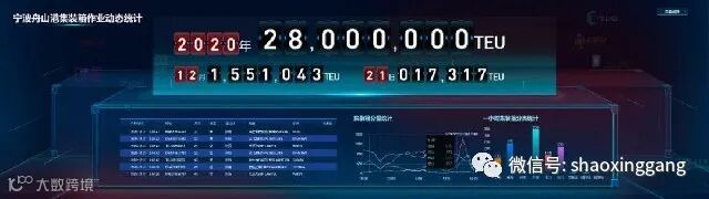 2020年12月21日凌晨,随着宁波舟山港调度指挥中心大屏幕上的集装箱实时生产数据跳过“28,000,000标准箱”,宁波舟山港年集装箱吞吐量首次突破2800万标准箱,再创新高。目前,全球仅有三个港口年集装箱吞吐量超2800万标准箱,分别是上海港、新加坡港、宁波舟山港。
