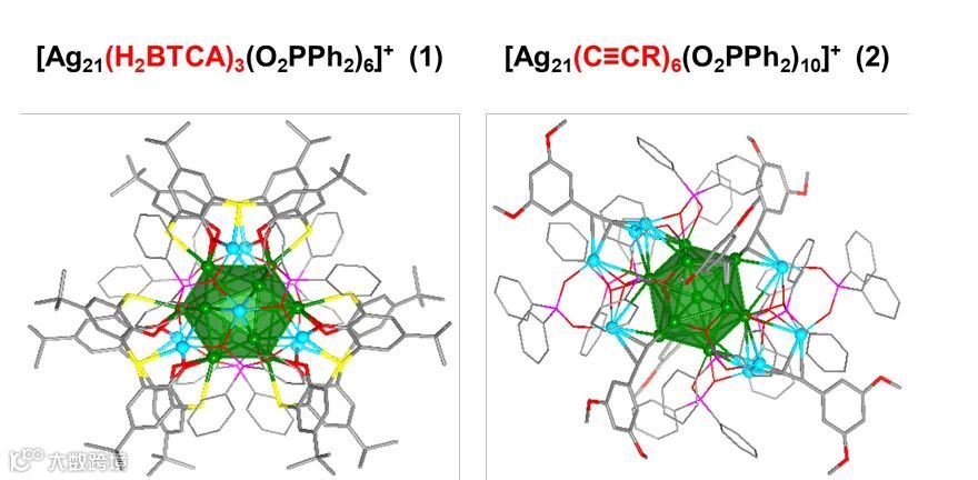 近日,清华大学的王泉明教授课题组采用配体工程策略构建了两个具有相同金属核心但不同电子结构的Ag21团簇,即[Ag21(H2BTCA)3(O2PPh2)6]+(1) and [Ag21(C≡CR)6(O2PPh2)10]+(2) (H4BTCA= 对叔丁基硫杂杯[4]芳烃, R =C6H3-3,5-OMe),并研究了电子结构对两个银团簇的稳定性和催化活性的影响。