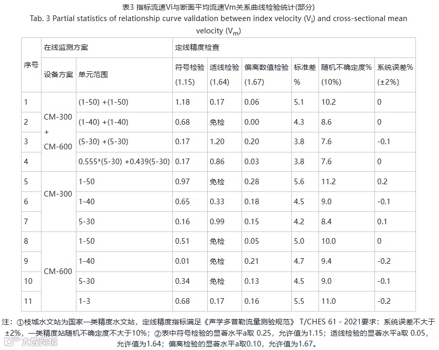 分析指标流速与断面平均流速关系曲线检验情况发现,所优选方案大多能通过定线精度检查和三项检验,其中2台设备指标流速单元区间选择均为5~30时,为3种方案下随机不确定度最小区间,整体定线精度和三项检验结果也为不同区间选择中最优方案。且该区间选择下,双部倾斜安装H-ADCP同步在线监测方案较各单部倾斜安装H-ADCP在线监测方案定线推流模型精度和检验效果更好。