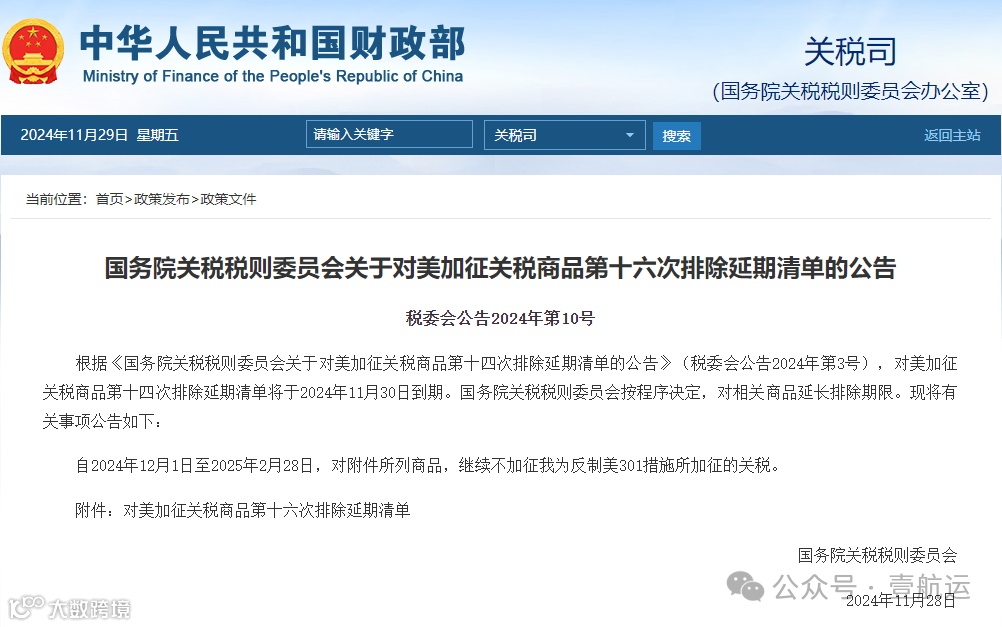 公告里称,经国务院同意,国务院关税税则委员会公布对美加征关税商品第十六次排除延期清单,对《国务院关税税则委员会关于对美加征关税商品第十四次排除延期清单的公告》(税委会公告2024年第3号)中的相关商品,延长排除期限,自2024年12月1日至2025年2月28日,对附件所列商品,继续不加征我为反制美301措施所加征的关税。