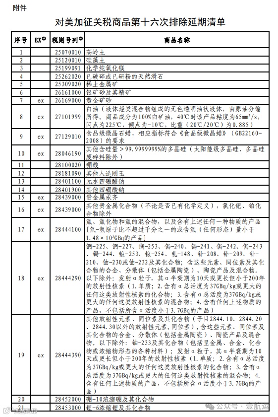 据壹航运最新获悉:11月29日,国务院关税税则委员会发布了《国务院关税税则委员会关于对美加征关税商品第十六次排除延期清单的公告》。