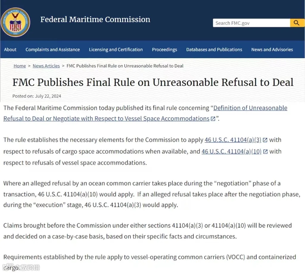 近日,美国联邦海事委员会(FMC)针对船公司不合理拒绝订舱的行为发布了最终规则,该规则将于2024年9月23日正式生效。