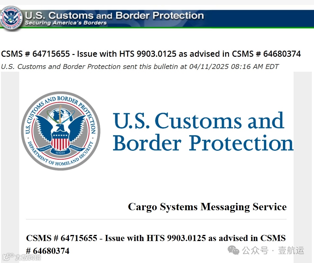 据壹航运最新获悉:当地时间周五(4月11日)美国海关和边境保护局(CBP)周五警报: 因海关系统出现故障,暂时无法受理符合关税豁免条件货物的通关处理!