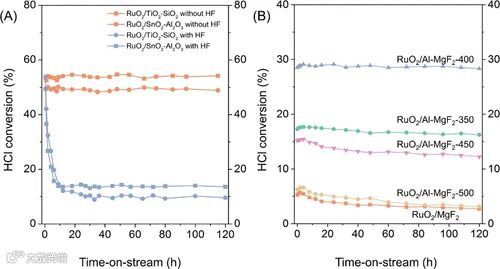 图2. RuO2/TiO2−SiO2、RuO2/SnO2−γ-Al2O3(A)和RuO2/Al-MgF2-T(B)催化剂在HCl(含和不含HF)催化氧化反应中的TOS图(反应条件:350°C,GHSV=30000 mL(STP)/(h•gcat),无HF进料气组成:20 vol%HCl,40 vol%O2, N2平衡气;含HF进料气组成:400 ppm HF,20 vol%HCl,40 vol%O2, N2平衡气)