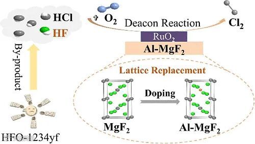 浙江师范大学含氟新材料研究所的马睿博士领衔的研发团队与巨化集团有限公司合作,近日,在国际知名期刊ACS Catalysis上发表研究文章,采用溶胶-凝胶法制备出RuO2/Al-MgF2催化剂。研究表明,在制备Al掺杂的MgF2载体(Al-MgF2)时,优化煅烧温度可改变MgF2的晶胞参数,使其接近于RuO2的晶胞结构,这有利于提高RuO2与Al-MgF2的相互作用,改善RuO2的局部化学环境,从而提高RuO2/Al-MgF2催化剂的催化氧化活性和在HF共存时的稳定性。其中,优化制得的RuO2/Al-MgF2催化剂在含少量HF的HCl催化氧化中表现出优异的催化性能,可望实现产业化。