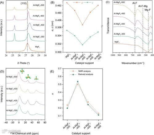 图 3. MgF2和Al-MgF2-T载体的XRD图谱(A),晶胞参数(B),FT-IR 光谱(C),27Al NMR谱(D),以及Al-MgF2-T载体中的Al含量比值(E)