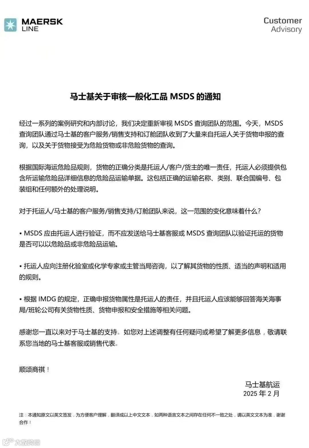 后续,马士基的客服/销售/订舱团队,将不再处理MSDS验证或货物分类咨询。