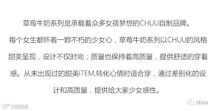 chuu,韩国本土网红潮流时尚品牌。2012年创立于韩国首尔。甜辣,轻运动,高调张扬的自我穿搭方式。